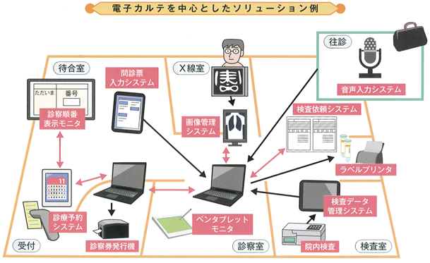 | 最先端と評される診療所の多くは、業務の大半をIT化し、IT機器を中心に運用を組み立てております。ソリューション型においては、電子カルテなどの中心となるシステムを決めて、情報を可能な限りそこに集約する工夫が必要になります。集約されることで、患者に対する情報を画面で一覧確認できるようになったり、職種ごとに必要な情報をセグメントできます。 |
