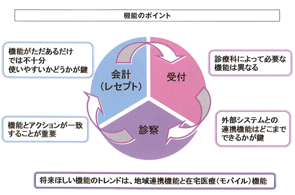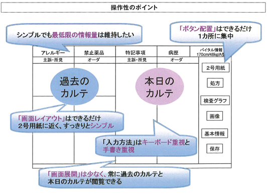 | 機能の使いやすさとは、クリック数や画面展開に大きく影響されてきます。言い換えれば、機能があっても使いにくかったらよくなく、直感的でなければいずれは使用しない機能となってしまう。さらに、機能と動きが一致することはとても重要です。 ・また、他のシステムとの連携する機能も重要視されております。特に今後は「地域連携」と「在宅医療」の機能の要望が増える傾向があり、前者では紹介状のやりとりが記録や、セキュリティが保護された環境の下で。リアルタイムに送付できたりする機能。後者は患者の自宅や老人ホームなどで電子カルテの入力を行いたいというニーズに対応する機能があります。 |