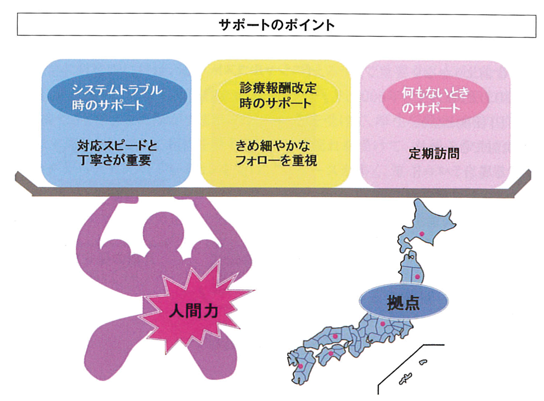 | サポートは主に、電話やメールなどの対応になる1次サポートと、リモートメンテナンスや駆けつけサポートなどの2次サポートに分けられます。サポートの良し悪しを決定する要素は、システムトラブル時の迅速な対応と丁寧な応対にあります。また、何もない時のサポート(定期的な様子伺いを行うような)も重要です。電子カルテはサポート商品だと言われるほど、サポートは電子カルテの日々の運用において重要なことになります。 |