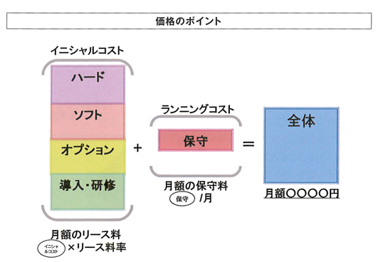 | 価格で検討する場合、ハードやソフトなどの「イニシャルコスト」と、保守・サポートなどの「ランニングコスト」の両面を考慮する必要があります。また、価格は情報収集が命と言っても過言ではありません。買いたいメーカーが決まったら、後は価格交渉に入るが、友人や知人などのネットワークを使い、いくらくらいが相場なのかを把握する必要もアリアます。 |