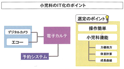 診療所のIT化を考えるうえで、電子カルテを代表格として、画像ファイリングシステムや予約システムなどのIT化の範囲が広がってきている。それぞれの製品の進歩に合わせるように、診療科ごとのIT化への好みの違いも鮮明になってきました。今回、「内科」と「小児科」についてご紹介致します。